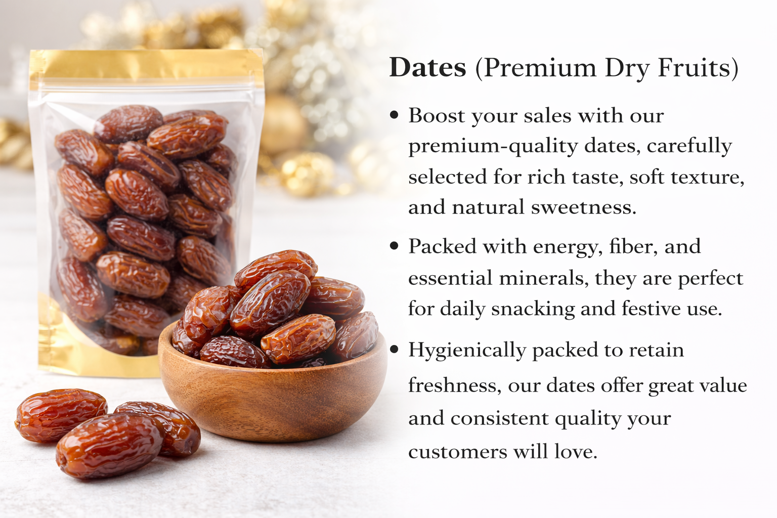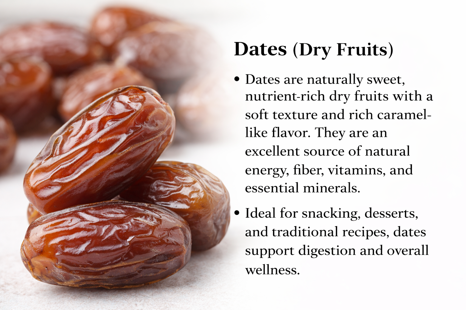 Dates are naturally sweet, nutrient-rich dry fruits with a soft texture and rich caramel-like flavor. They are an excellent source of natural energy, fiber, vitamins, and essential minerals. Ideal for snacking, desserts, and traditional recipes, dates support digestion and overall wellness.